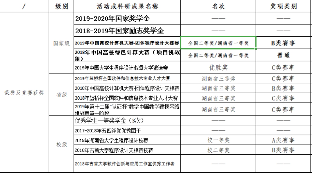 曾任软件创新与应用工作室主任;2019-2020学年国奖获得者;曾获编程类学科竞赛省级荣誉5项,国家级4项,校级5余项;以第一作者公开发表或录用论文三篇,其中一篇为中科院二区,被SCI、EI检索,一篇为北核、CSCD(录用),一篇被会议EI、CPCI检索;第一作者申请软件著作权一项;目前已保送至中科院成都计算所攻读硕士。