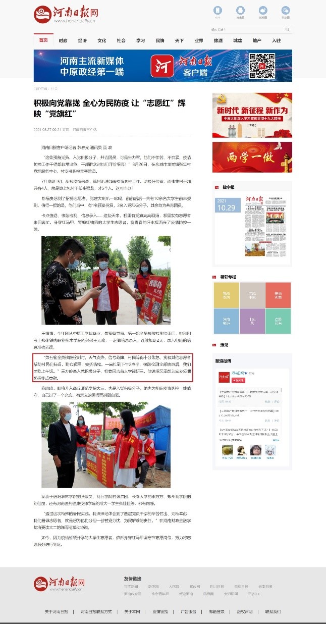 从2020年1月下旬开始,新型冠状病毒在中华大地上肆虐。在这场抗击疫情的阻击战中,无数党员干部和志愿者奋战在防控疫情的第一线,掀起了一场抗击疫情的没有硝烟的战争。这其中中国青年表现出了大无畏、敢作为的责任担当精神。我看到了新时代的青年人不惧风雨的挑战、勇往直前抗病毒,彰显出了青春的蓬勃力量,交出了一份合格的、富有活力的答卷。然而在2021年的盛夏时节,当疫情再次侵袭到我所在的商丘市后,在看到众多前辈在之前抗击疫情的无私奉献后,我觉得作为一名入党积极分子应该为我所在的地区奉献出自己的一份力量。此次疫情期间,我有幸参加了志愿者活动。在此期间虽说有劳累、有被误解,但是在完成任务后收获到了满满的责任感,与自豪感,我感到了无比的充实。从8月12号起,由我和同村大学生组成的大学生志愿者团队,在了解到村内干部人手不足,需要招募志愿者后,积极响应我们村党支部的号召,在村领导的带领下开始了疫情防控的志愿者活动。在这次活动中结识了许多志同道合的朋友,都期望能为社会和家乡奉献自己的一份力量。自此以后,一个个红袖章和红马甲出现在主要路口执勤,登记检查通过村里的车辆,为村里的外来人员登记信息,测量体温,并为来往人员传播防控疫情的常识。考虑到大部分留守乡村的都是老人和儿童,如何进行核酸检测的信息录入成为在核酸检测中的一个主要问题。我们在接到任务后,积极协助核酸检测的医务人员进行被检测人员的信息录入,为了避免聚集,我们每次核酸检测都要顶着30多度的室外高温,在安抚村民情绪的情况下,在10天内完成对全体村民的6轮核酸检测。在每一次的核酸检测时,只有中午一个小时的休息和吃饭的时间,感觉最累的时候就是顶着两三点的太阳仍要进行信息采集,在但是想想全副武装的医务人员比我们更受煎熬的时候,就会觉得自己所做的贡献真的很小。在结束每次核酸检测后,我们按照要求对检测场地进行消杀工作。协助医务人员的同时,我们还需要进行卡点执勤任务,对进出村的人员进行严格管控。刚开展防控工作时,一些年纪较大的老人不能充分认识到疫情的严重性,没戴口罩就出门。我们就耐心向他们解释戴口罩的原因和不戴口罩的风险。经过劝说,老人们外出都戴起了口罩,不再随意出门。在进行外出返乡人员的信息核验和核酸检测报告查验时,需要统计其返乡行程及其返乡途中是否进行个人防护并查看其行程码、健康码、对其进行体温测量、物品消毒,最后将信息进行上报,并督促其自行居家隔离14天。虽然都是细节问题,但是如何做到让大家积极配合自己的工作,我们还是绞尽脑汁来安抚大家的情绪。在这些义务活动中,虽然很热很累,但是在一次次核酸检测报告没有异常和防疫卡点撤去的时候,我觉得这些都是值得的。在完成此次疫情阻击战后,我很荣幸以一名吉大学子的身份接受河南日报的采访,并向大家讲述自己在这期间的经历。