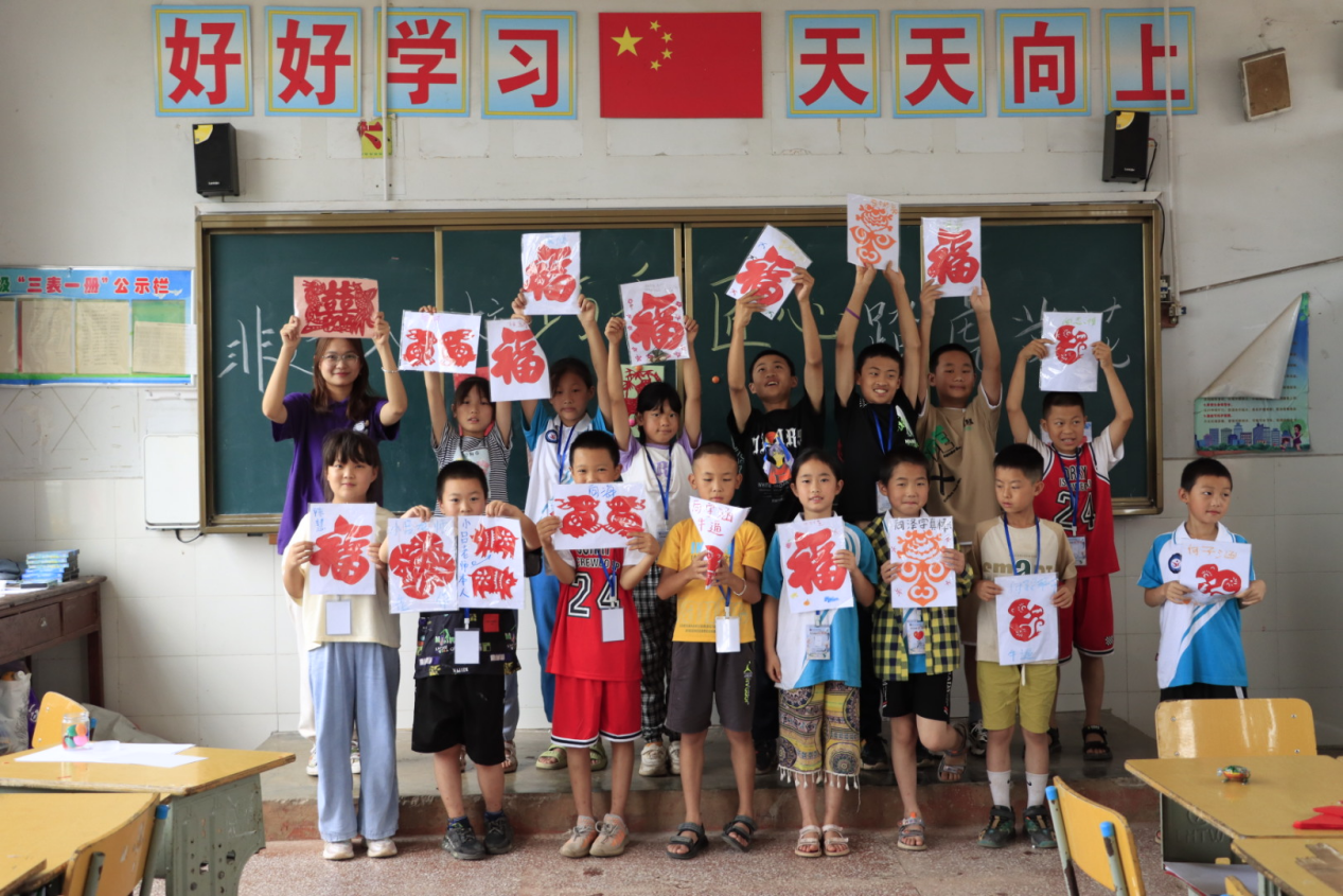 图为晏鑫源在三下乡“非遗入校 踏虎凿花”剪纸课与学生的合影