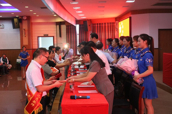 庆祝表彰大会开始,全体起立,奏唱国歌。