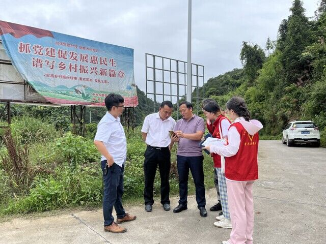 图为当地驻村干部同服务团成员讨论分叉口标识景观设计