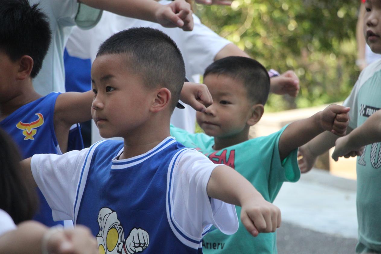 在教学过程中,孩子们自发分组,以童真和创意演绎舞蹈:有的孩子排成纵队,随着节奏蹦跳并变换队形;有的孩子分散站立,用拍手和比心的动作相互呼应。孩子们眼神明亮、姿态活泼,将对舞蹈的喜爱融入到每一个动作中。休息的间隙,几个孩子追着志愿者跑,有的拽拽志愿者的衣角,有的凑到志愿者身旁,小声地分享:“跳这个舞可好玩啦!”“我刚才没跟上节奏,下次肯定能跳得更好!”质朴的话语中充满了对参与活动的欢喜。