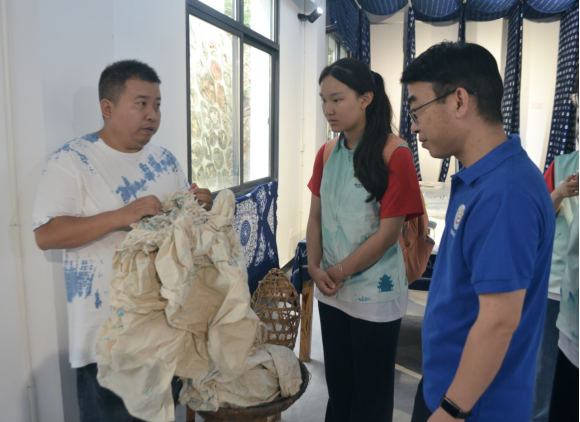 在芙蓉桥白族乡合群村的游客体验中心,一场跨越时空的文化交流盛宴悄然启幕。合群村副书记谷俐为志愿者们详细叙述了扎染这项非物质文化遗产的悠久历史及其在白族人民生活中的独特价值与地位。