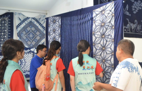 活动中,在专业匠人的悉心指导下,志愿者们纷纷化身为文化的传承者,从精心挑选布料开始,到巧妙设计图案,再到沉浸于古老工艺之中,每一步都充满了对未知的好奇与对传统的敬畏。志愿者们细心地将洁白的棉布折叠、扭曲、缠绕,每一次的折叠都如同在布上绘制无形的图案,心中充满了对即将展现的色彩的无限遐想。随后,他们小心翼翼地将它浸入调配好的染液中,蓝靛的深邃与染料的奇妙反应,让棉布逐渐展现出层次分明的蓝白纹理。当看到一块块普通的布料在时间的洗礼下绽放出独一无二的的花纹时,每个人的脸上都洋溢着满足的笑容。