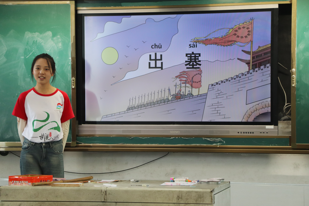 “老师,边关是沙漠吗?”、“老师,‘为什么人未还’啊?”、“老师,王昌龄为什么写这首诗?”在朗读完王昌龄的《出塞》后孩子们纷纷表达自己的疑惑。志愿者杨珂冉对于孩子们的问题一一做出回答,并且向孩子们表示,唐代频繁的边塞战争,使人民不堪重负,《出塞》正是反映了人民对和平安定生活的期望。
