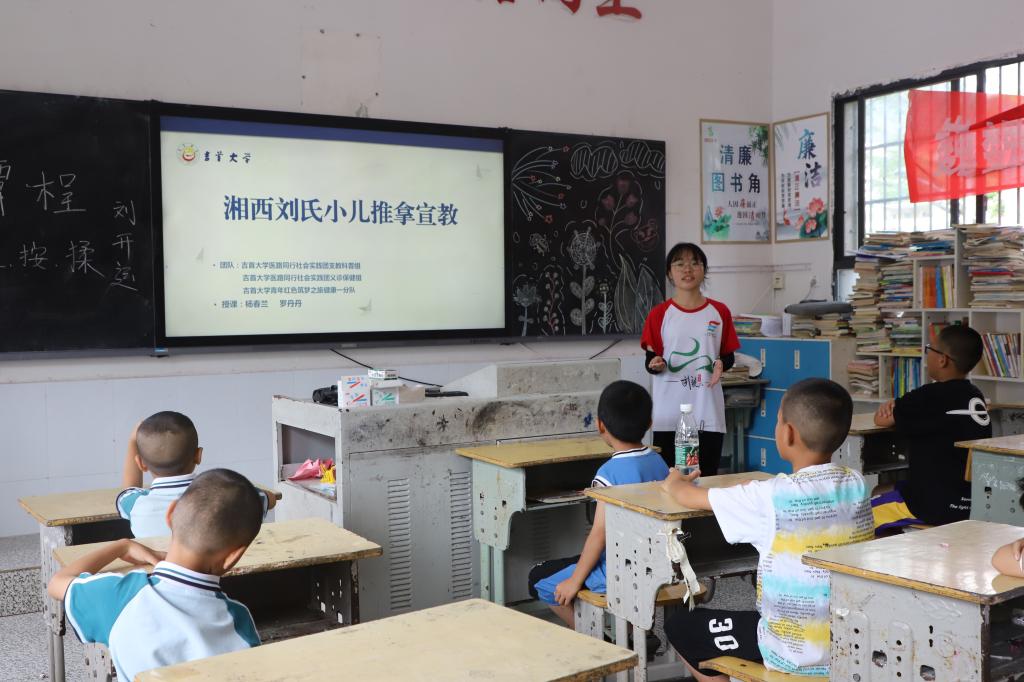 湘西地区多农村,留守儿童由于长期与父母分离,缺乏家庭关爱和支持,心理健康问题日益突出。为进一步了解留守儿童的心理健康状况和教育需求,团队成员与当地学校和社区深入交流,设计心理测量问卷并开展人物访谈,深化建设青年志愿者、专家教师、驻村干部、团学骨干“四位一体”的留守儿童关爱体系。此外,支教科普团招收十五名当地留守儿童,针对科学教育、体育锻炼和艺术素养等方面开展留守儿童预防蛀牙、安全用药、七步洗手法等具有医学特色的教学活动,积极引导小朋友们学习正确的防护知识,养成良好的生活习惯。