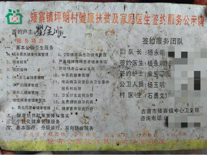 图为矮寨镇坪郎村健康扶贫及家庭医生签约服务公示牌