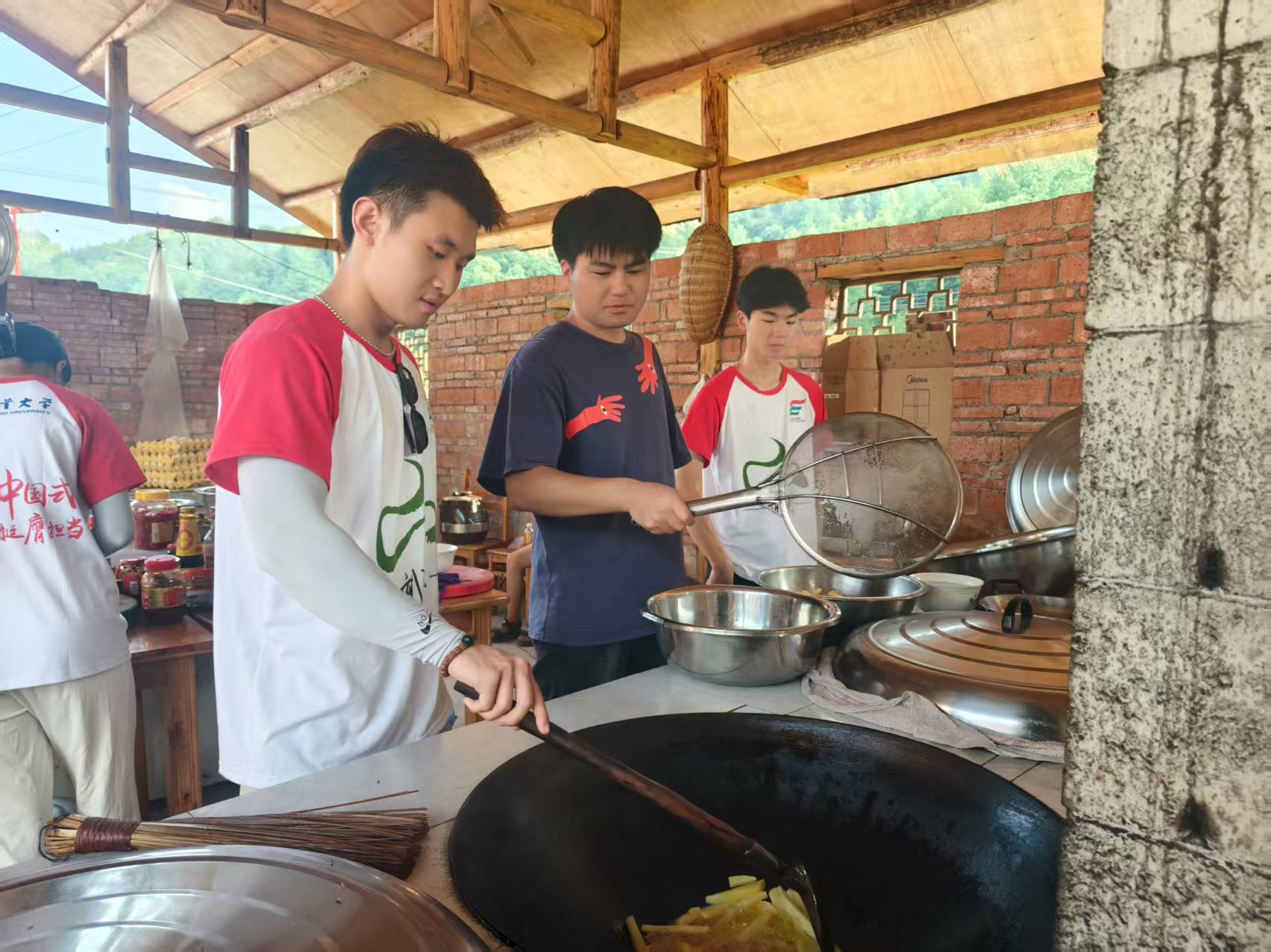 近午时分,灶火熊熊,热浪灼人。同学们挥动着锅铲,翻炒着大锅里的胡萝卜烧肉,豆大汗珠浸透衣衫。