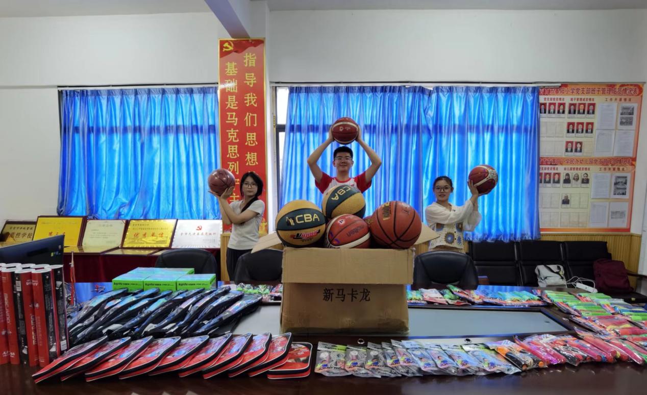 图为 “小杏仁”社会实践服务团志愿者清点向寨阳小学捐赠的体育器材