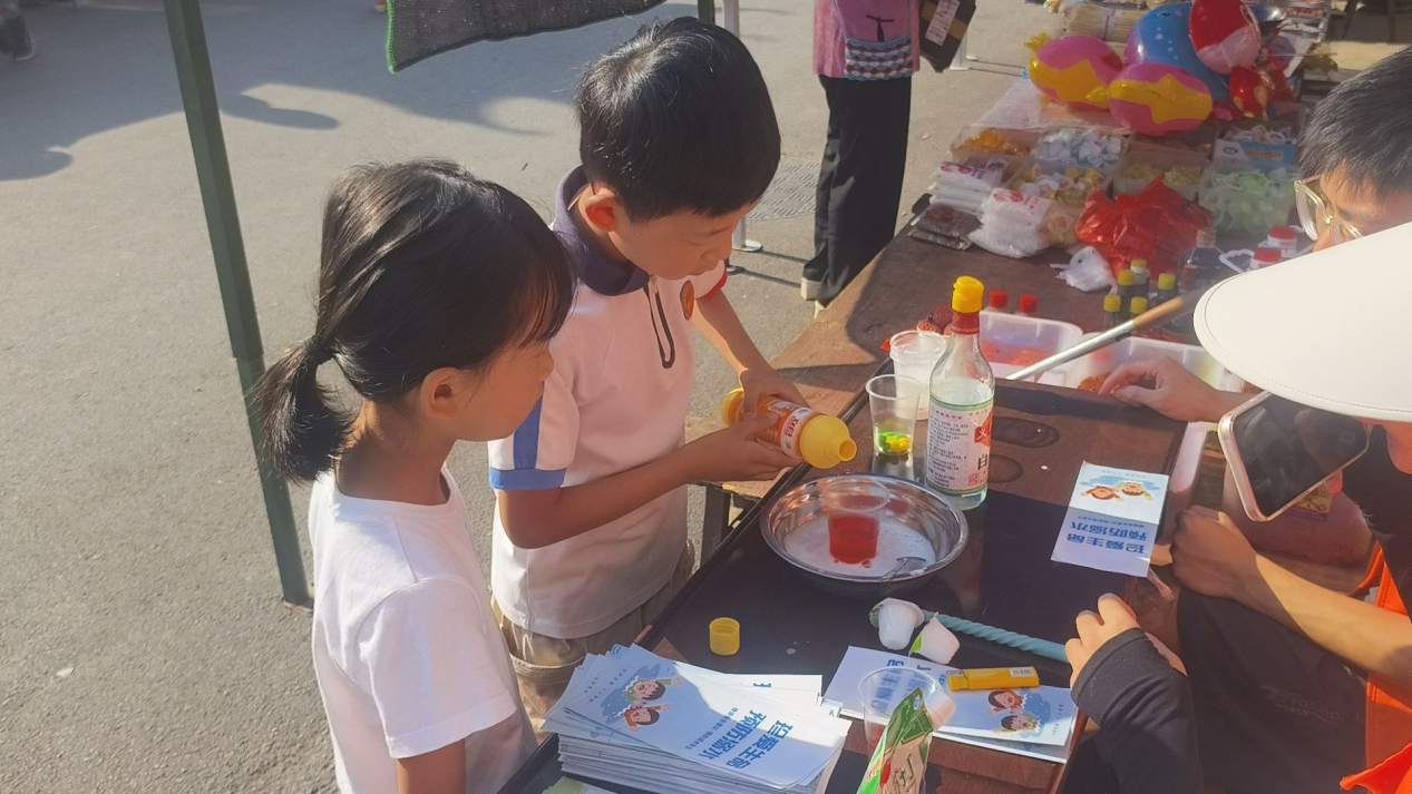 随着集市热闹起来,孩子们被摊位前的“神秘装置”吸引,却因羞涩驻足。实践团成员主动上前问候,邀请孩子们靠近。在“火山喷发”实验中,小苏打与白醋剧烈反应,泡沫如岩浆般涌出,让孩子们瞪大双眼,好奇目光中闪烁着求知渴望。