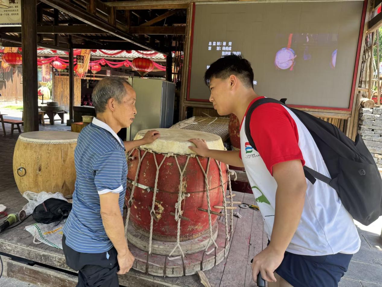 实践队还拜访了苗鼓制作匠人时金光。时师傅详细讲解苗鼓从伐木、刨皮到雕刻纹路等制作的12道工序。选料要取深山老杉,鼓皮需用三岁黄牛背皮,制作周期长达半月。他轻抚鼓面,讲述苗鼓在节庆祭祀中的重要地位,并誓言要“守住苗家人文化根脉”。