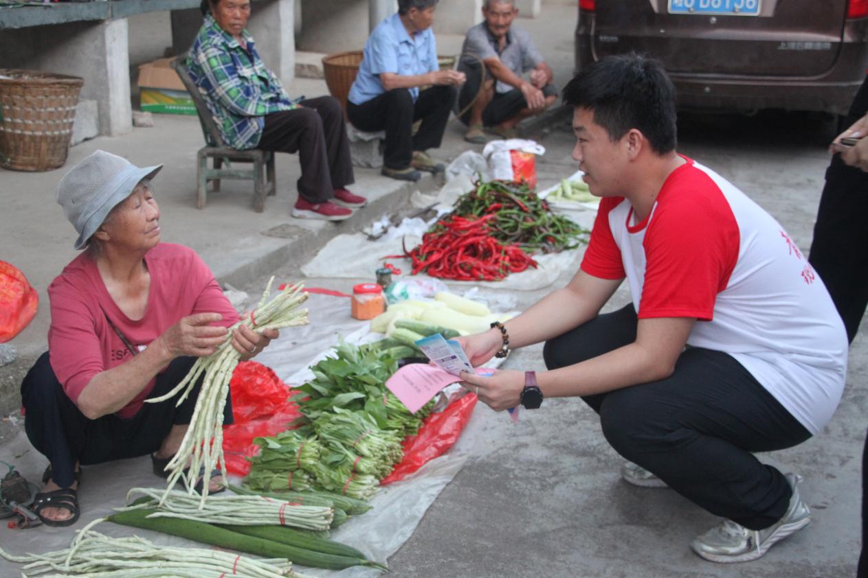 针对教育资助政策,队员们逐句拆解生源地助学贷款申请条件、助学金评定标准,对 “线上申请流程”“异地就学政策适用范围” 等高频问题进行细致解答。“以前只知道水危险,听你们一讲心里踏实多了!” 一位村民接过防溺水宣传手册时感慨道。随着队员们在摊位间的走动,教育资助政策要点、防溺水口诀逐渐在市集里传开。这场穿梭在菜篮与摊位间的知识传递,既保障了实践物资需求,更让安全意识与惠民政策如夏日细雨,浸润村民心间。