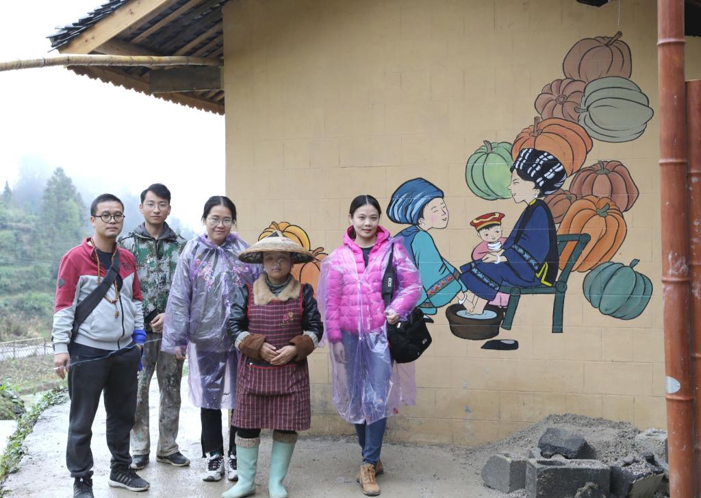 美术学院党委高度重视,王浓章书记和刘俊院长召开专门会议进行研究,组织专门创作班子进行策划创作,安排学生第一党支部部分党员参加创作实践。2018年10月12日,刘俊院长带队考察,来到山寨农家,体验当地风俗风貌,生产实践。体验之后,学院党委组织创作班子,根据当地文化特色,决定以墙绘为载体,创作了3套绘制方案并进行了具体创作分工。之后一周,学生第一党支部党员王卓敏、胡潇文、宋灿、陈述带领墙绘组成员,根据地理位置和墙面材料,精心挑选了墙面完成了起稿、勾勒、填色、排版等具体创作。2018年10月19日,王浓章书记对创作进行了最后审定。2018年10月20日,美术学院学生第一党支部老师学生再次来到十八洞村,大家克服了种种现实困难,短短两天时间,生动墙绘画面已基本成形。