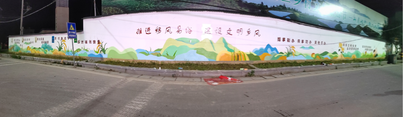 其次,负责墙绘绘制工作的学生成员立足天门山镇实际情况,调研乡风文明建设的需求。在天门山镇领导、大坪社区书记的协调支持下,对天门山镇主干道上3面共计130米的白墙进行了测绘、设计,并结合需求完成了一面长度50米的墙绘,内容既有天门山镇特色产业、代表场景,也有移风易俗等乡风文明政策宣传的内容,起到了美化环境、传播文明的积极作用。
