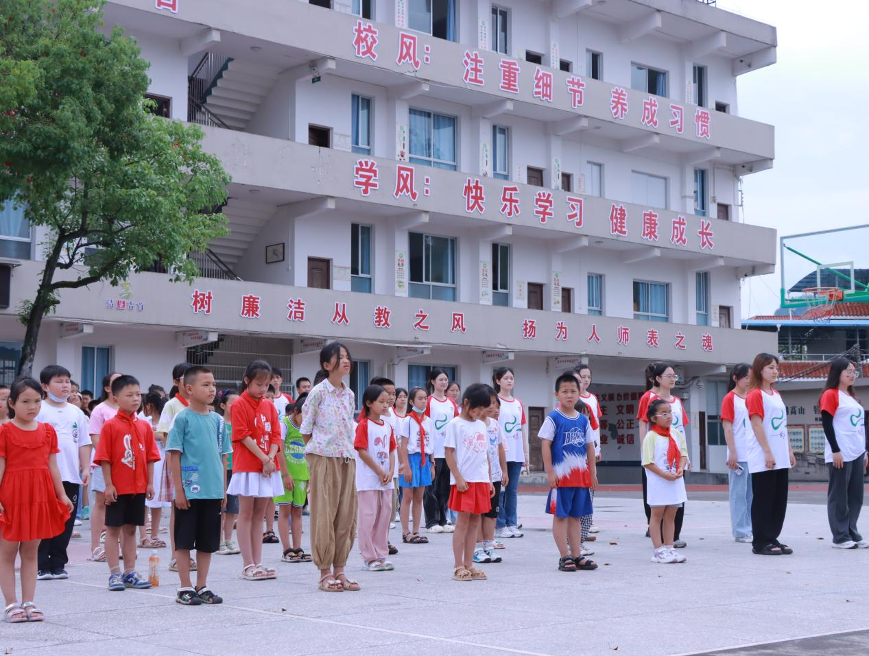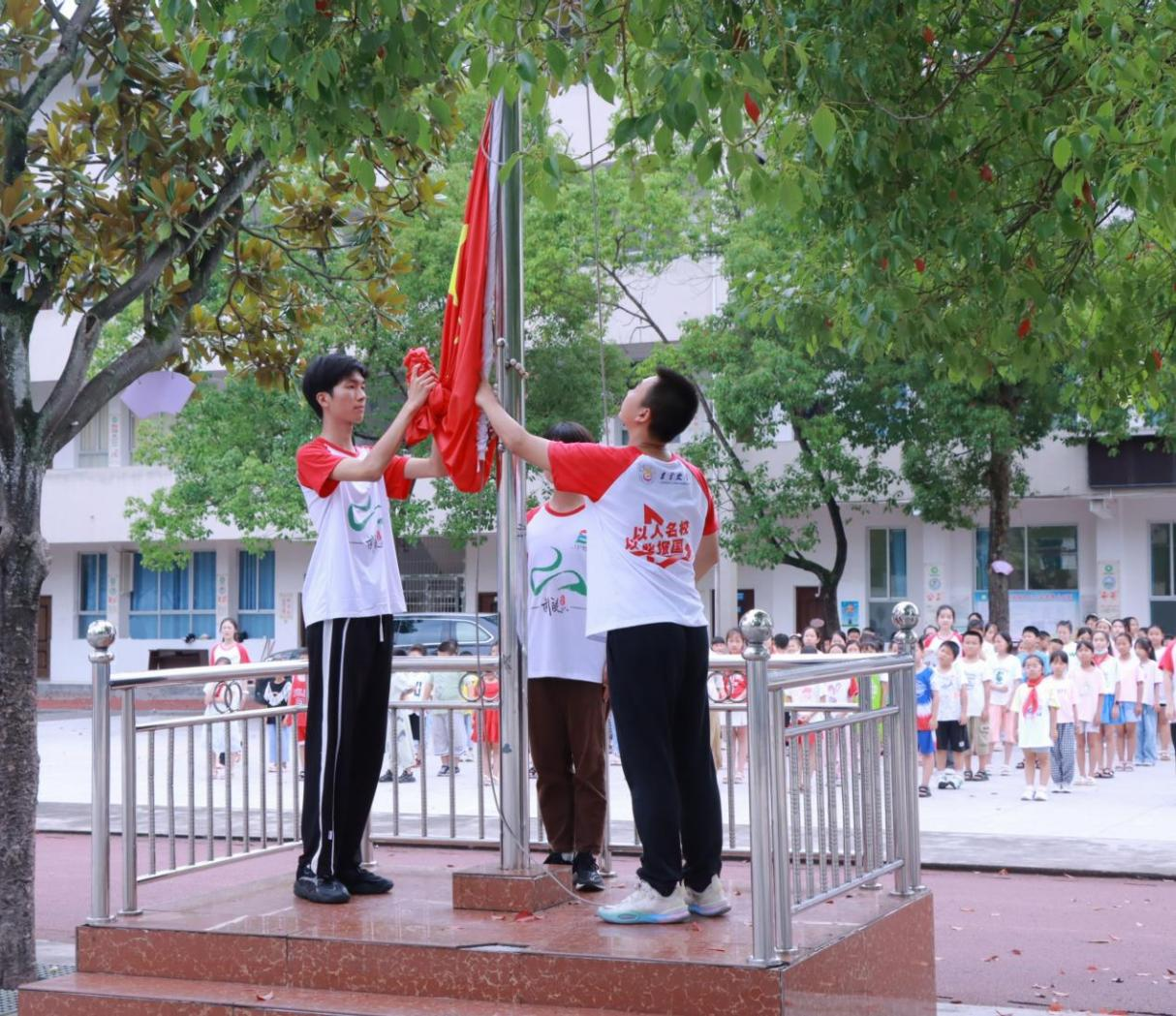 升旗仪式由志愿者罗田甜主持,特邀三名志愿者护旗。国歌起,国旗升,五星红旗在全体志愿者与学生的注目下冉冉升起,在湛蓝的天空映照下显得更加鲜艳。