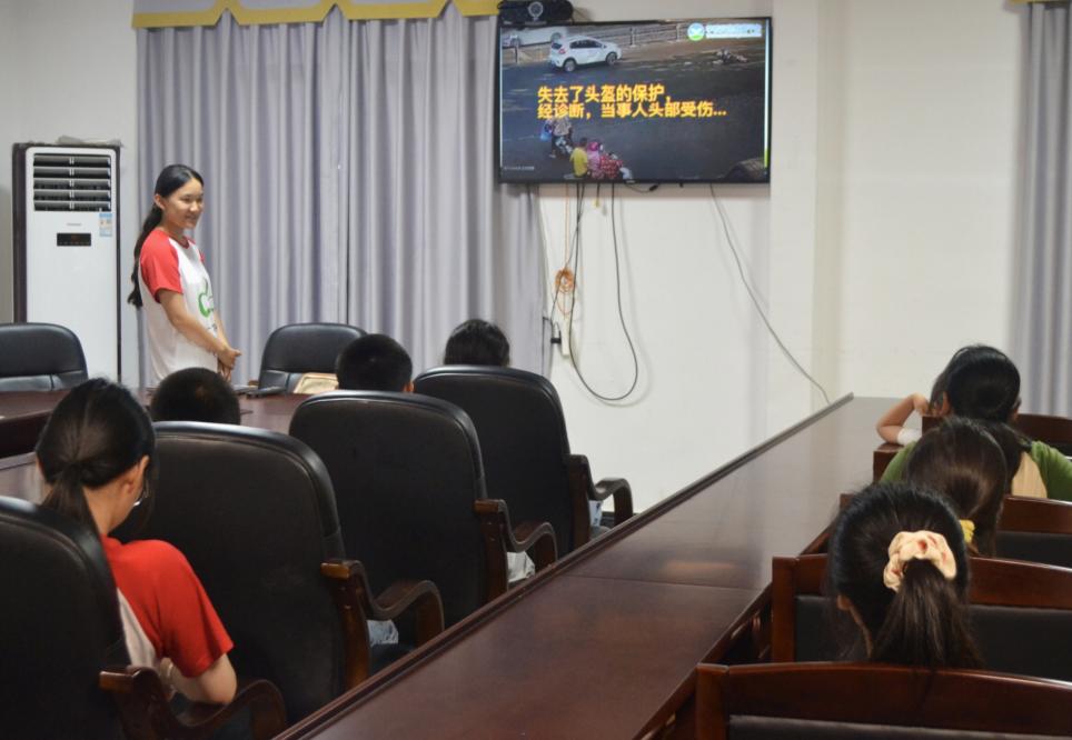 (图为志愿者带领孩子们观看安全教育片)