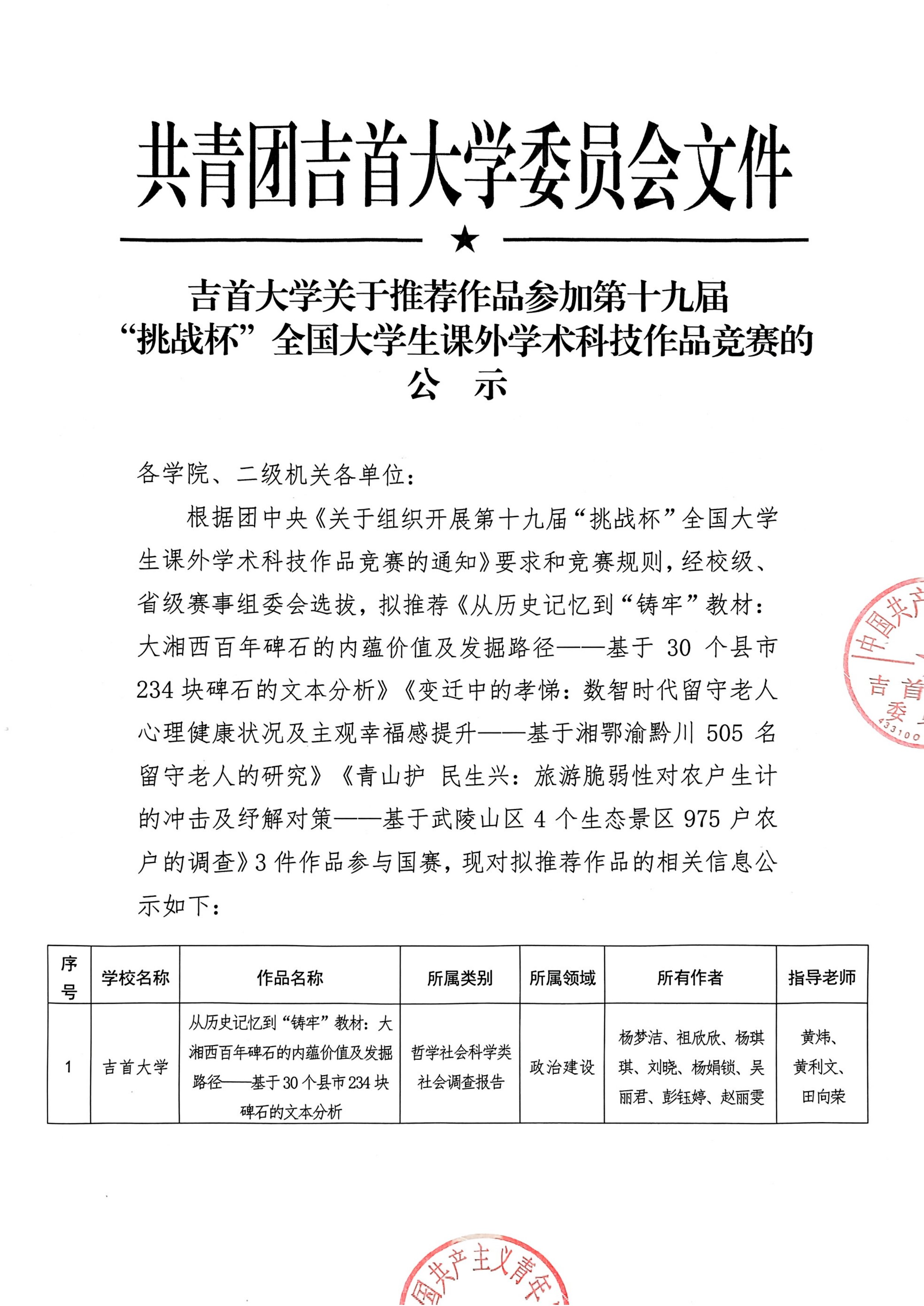 WilliamHill体育关于推荐作品参加十九届“挑战杯”大学生课外学术科技作品竞赛的公示